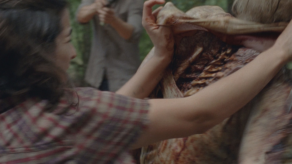 In Daryl’s taped interview, he still has his dead possum and acts very much the caged animal that he seemed like when Rick first met him. Later he’s cleaning the possum right on the steps of their new home as Rick and Carol discuss their next steps. Rick decides they’re all staying in the same house for the night while Carl shows us he’s not exactly kid-friendly anymore. Hearing a noise in the house, he immediately draws his knife and goes to investigate. It’s nothing, but still – the boy is intense.